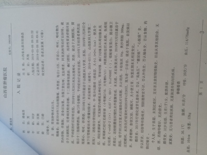 潘福贵:1.消化道穿孔修补术是2017-4-26做的,现在消化道没有穿孔的风险 2. 术后复查脉管有一些癌栓,是转移的征兆 3. 6月换方案了紫杉醇联合阿帕替尼还没复查